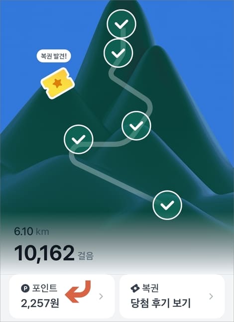 여기서는 만보기 걸음 수를 확인하고 포인트와 복권을 지급 받을 수 있는데요. 아래쪽에 포인트 버튼을 터치합니다.