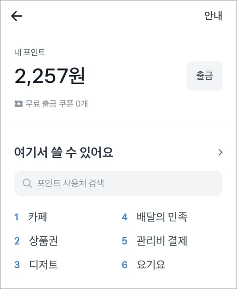 꼭 출금하지 않아도 카페나 배민, 상품권, 관리비, 요기요 등 다양한 사용처에서 현금처럼 사용할 수도 있습니다.