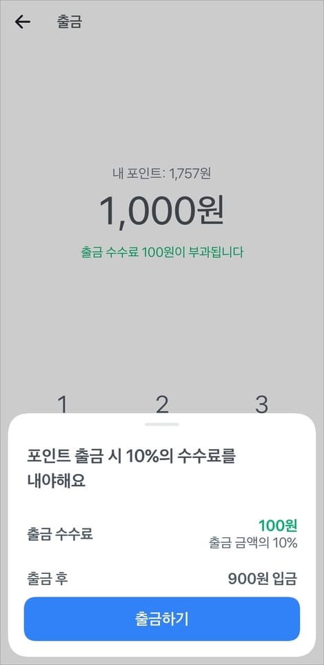 액수와 상관없이 출금할 때마다 10% 수수료가 발생한다는 점 참고하세요. 그러니깐 1천원 출금한다면 1백원은 수수료로 차감되고 9백원이 입금됩니다.