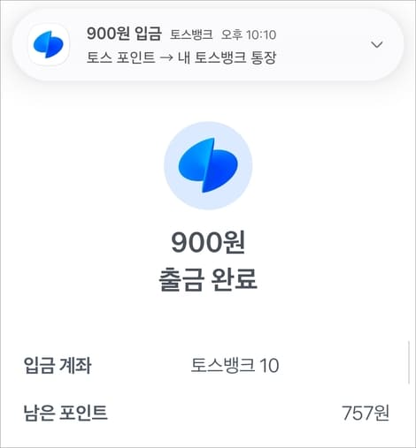 비밀번호 입력이나 지문인증을 완료해 주시면 토스 포인트가 내 토스뱅크 계좌로 입금됩니다.