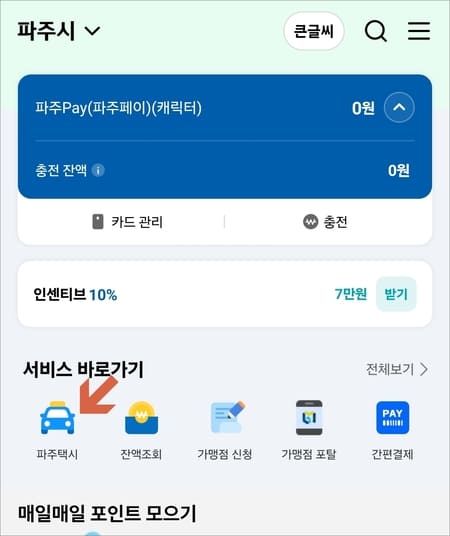 메인 화면 중앙쯤에 보시면 서비스 바로가기에서 파주택시 아이콘을 확인할 수 있습니다.