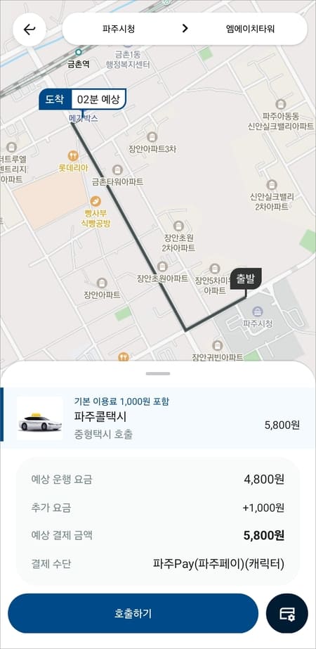 예상 되는 택시비 확인이 가능하며, 선택 가능한 결제수단으로는 언급한 파주페이 외에도 직접 결제 방식도 가능합니다.