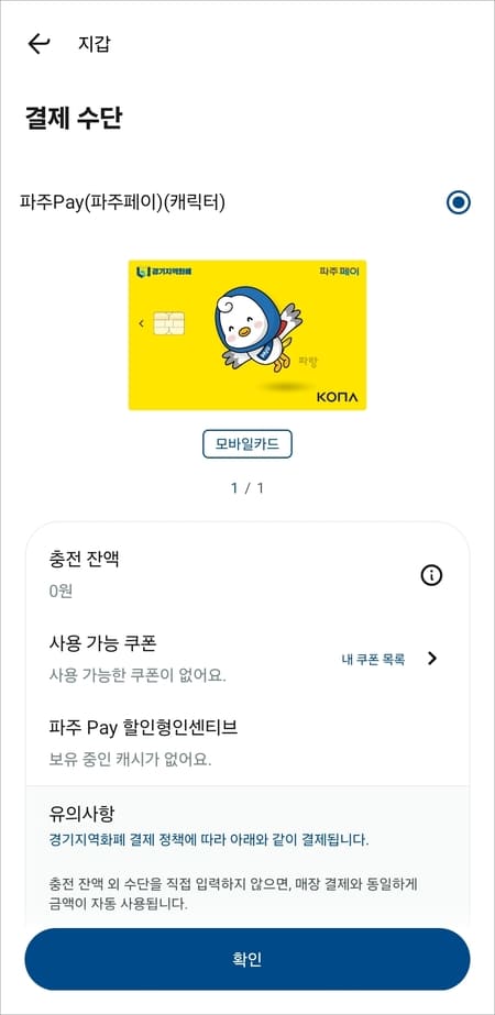파주 지역화폐로 결제하기 위해서는 파주페이 카드가 필요한데요. 없는 경우에는 경기지역화폐 앱을 통해서 카드 신청과 등록 후 이용하셔야 합니다.
