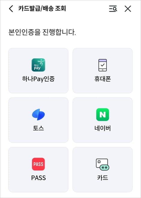 카드 배송 조회 시 본인 인증을 거쳐야 합니다. 선택할 수 있는 인증 방법 중에는 하나pay/휴대폰 문자/토스/네이버 인증서/통신사패스/보유 카드 인증이 있습니다.