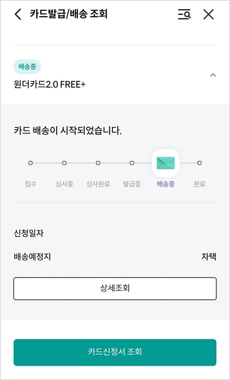 발급 중인 카드를 확인하시고 접수, 심사중, 심사완료, 발급중, 배송중, 완료 진행단계를 확인할 수 있습니다.
