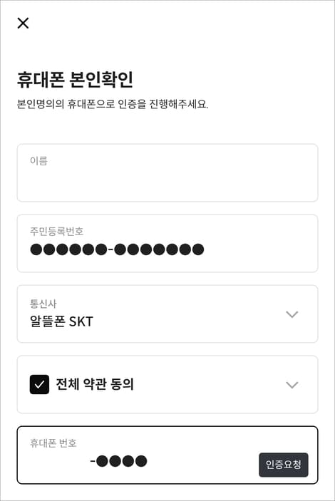 이름과 주민등록번호, 통신사, 휴대폰 번호를 입력하고 문자 인증을 완료합니다.