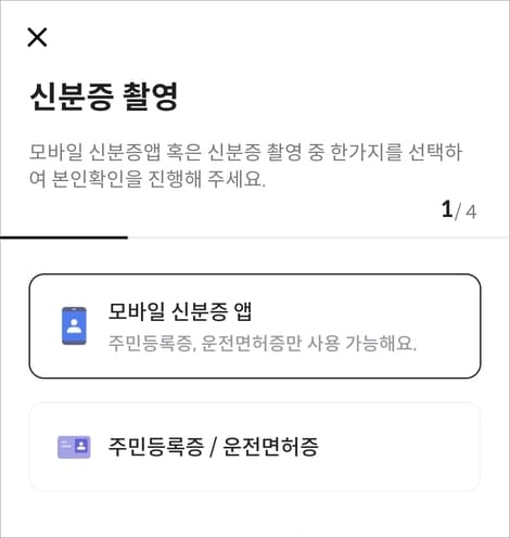 실물 주민등록증 또는 운전면허증을 어두운 바닥에 놓고 휴대폰으로 촬영해서 인증하시면 됩니다. 휴대폰에 행정안전부의 모바일 운전면허증이 발급되어 있다면 모바일 신분증 앱을 선택합니다.