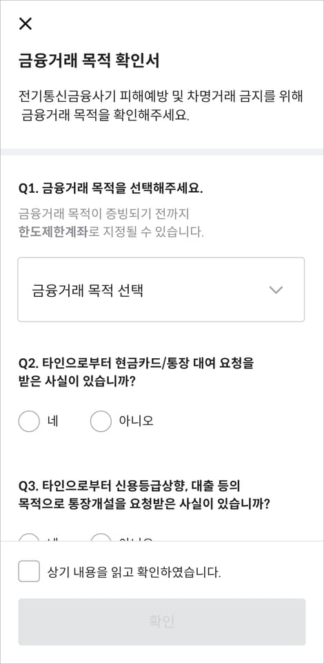 처음 거래 이용자이거나 금융거래 목적 확인이 증빙되지 않은 경우 한도제한계좌로 만들어집니다.