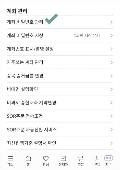 다음 화면 아래로 내려가 계좌관리 항목에서 계좌 비밀번호 관리에 들어갑니다.