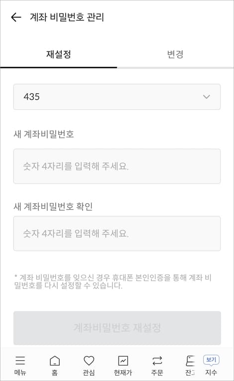 계좌 비밀번호는 주식 매수/매도 거래할 때나 계좌 관련 설정할 때 입력이 필요할 수 있으니 평소에 잘 숙지해 두는 게 안전합니다.