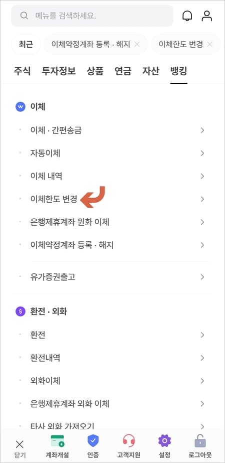 이체 항목에서 이체한도 변경에 들어갑니다.