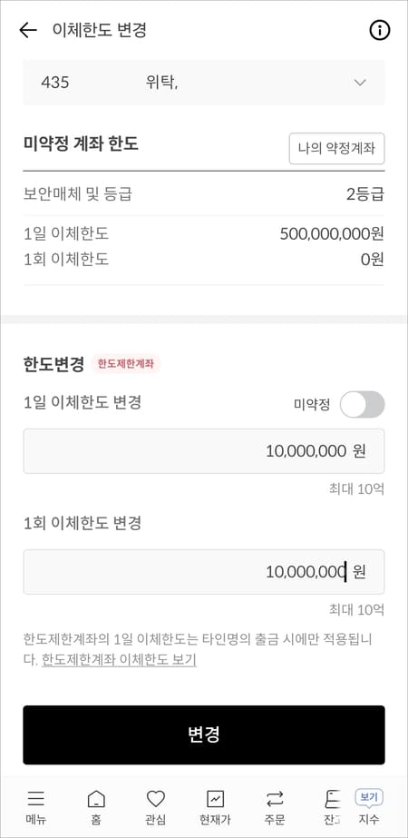 현재 본인이 사용중인 보안매체와 등급을 확인하고 해당 최대 이체한도 금액 내에서 1회/1일 한도 금액을 변경해 주시면 됩니다.