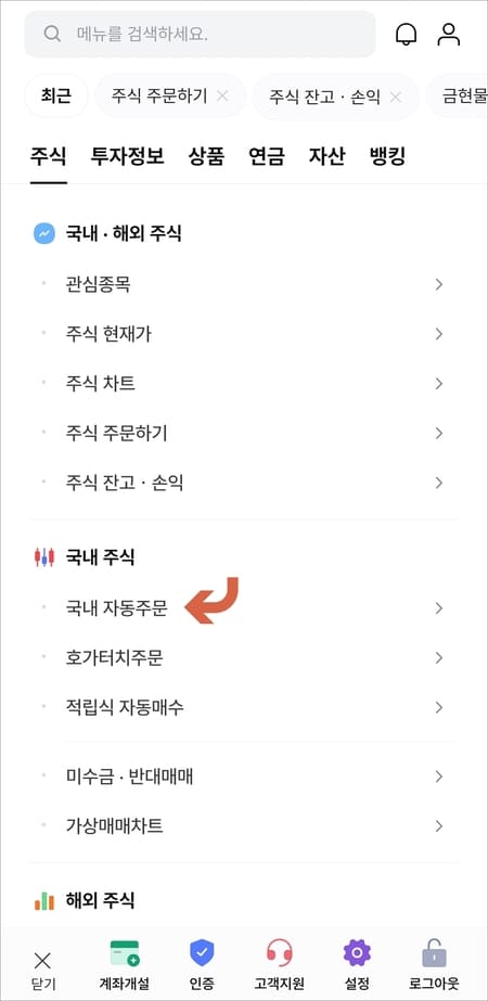 해당 화면으로 이동하면 국내주식 항목에서 국내 자동주문에 들어갑니다.