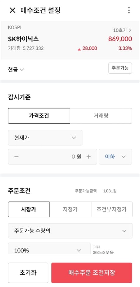 주문할 종목을 검색 선택하고 감시기준(가격조건/거래량), 주문조건(시장가/지정가/조건부지정가), 감시기간을 설정해서 저장 추가하시면 됩니다.