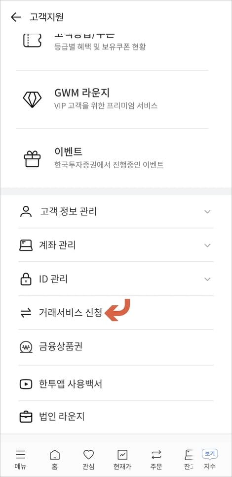 지원 화면을 아래로 내려보시면 거래서비스 신청이 있습니다.