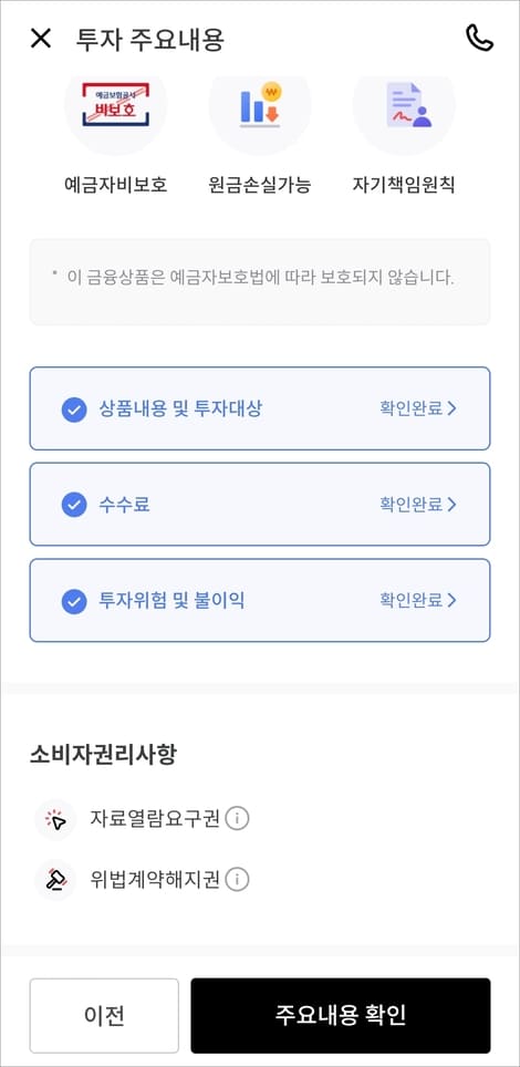 투자 주요내용(예금자비보호/원금손실가능/자기책임원칙)을 모두 확인하시고 안내에 따리 거래 신청 완료하시면 됩니다.