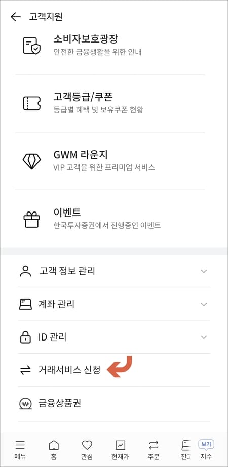 아래로 내려가서 거래서비스 신청을 선택합니다.