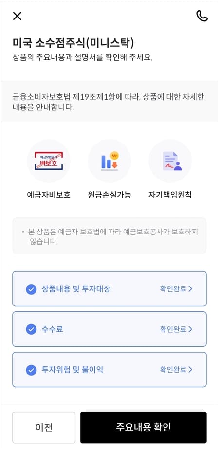 상품내용 및 투자대상, 수수료, 투자위험 및 불이익 확인을 완료합니다.