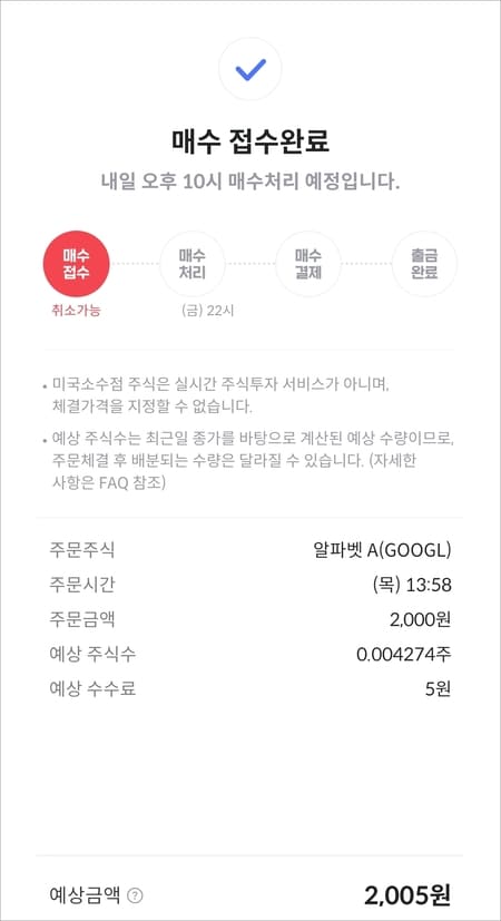 매수 접수가 완료되면 내일 오후 10시 매수처리 예정을 확인할 수 있습니다.