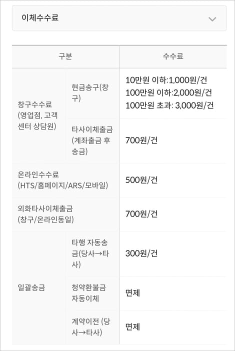HTS, 홈페이지, 모바일을 이용한 온라인 이체 수수료는 건당 500원입니다. 다만, 창구를 이용하거나 고액을 이체할 경우 1,000원에서 최대 3,000원의 수수료가 부과될 수 있습니다.
