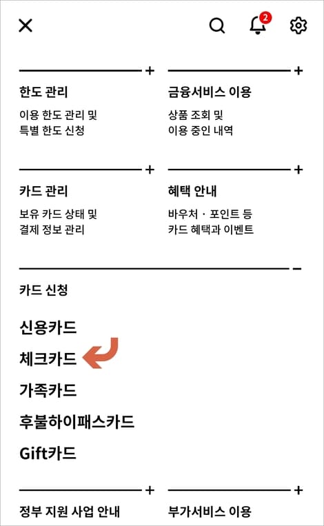 메인 화면 왼쪽 위에 3줄(≡) 모양을 누르고 카드 신청을 선택해서 체크카드에 들어갑니다.