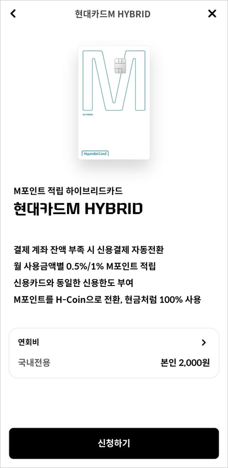 먼저 현대카드M 하이브리드는 월 사용 금액별로 0.5%(월 1백만원 미만 이용 시), 1%(월 1백만원 이상) M포인트 적립이 가능하며 적립한 포인트는 H-coin으로 전환해서 현금처럼 사용할 수 있습니다.