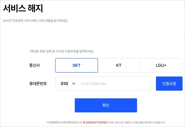 서비스 해지를 선택하고 통신사(SKT/KT/LG U+)를 선택하고 휴대폰번호 입력 후 문자 인증을 진행합니다.