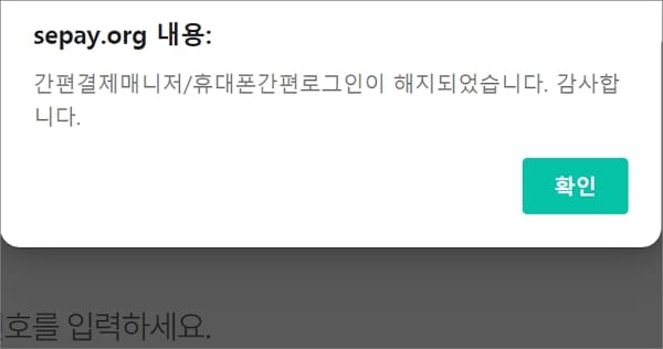 화면 상단에 간편결제매니저/휴대폰간편로그인 해지가 되었다는 안내창을 확인합니다.