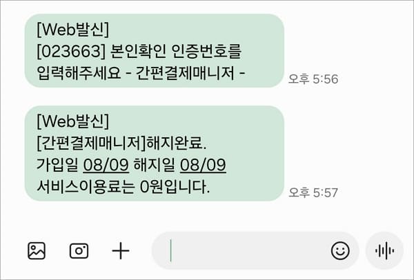 당일 해지 시 서비스 이용료는 빵원입니다. 본인도 모르게 해당 서비스에 가입되어 있는지 확인해 보시고 불필요하다면 서둘러 해지하시길 바랍니다. 본인이 이용 중인 통신회사 문자에 KCT 간편결제매니저 서비스 가입 결과 안내 문자가 있는지 확인해 보세요.