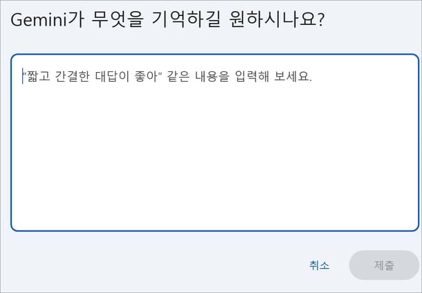 제미나이를 개인화 맞춤설정으로 사용할 수 있도록 기억하길 원하는 정보를 입력하고 제출합니다.