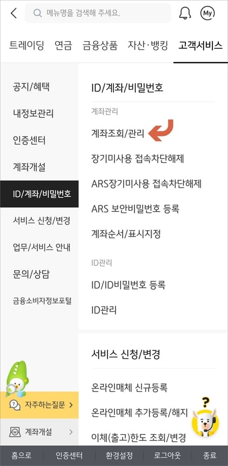 상단에 고객서비스를 선택하고 ID/계좌/비밀번호 항목에서 계좌조회/관리에 들어갑니다.
