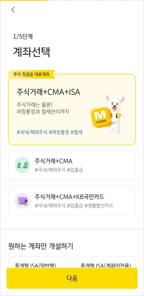 원하는 계좌만 선택해서 만들 수 있지만, 주식거래+CMA+ISA 등 세트로 선택해서 한 번에 개설도 가능합니다.