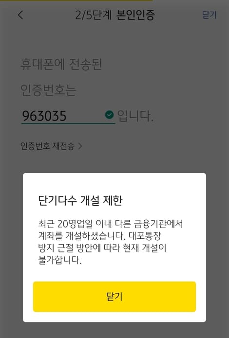 다음 단계로 진행하려니 최근 20일 이내 다른 금융기관에서 계좌를 개설했다는 알림창이 뜨네요.
