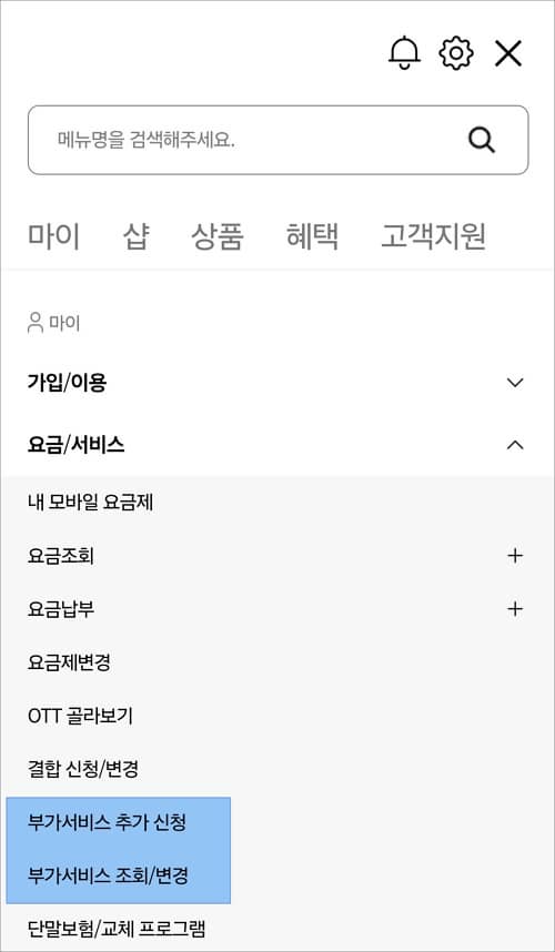 메인 화면 오른쪽 하단에 “메뉴(≡)”를 터치하고 화면이 이동하면 “마이” 항목에서 요금/서비스 메뉴를 누르면 부가서비스 추가 신청 및 부가서비스 조회/변경 메뉴를 확인할 수 있습니다.