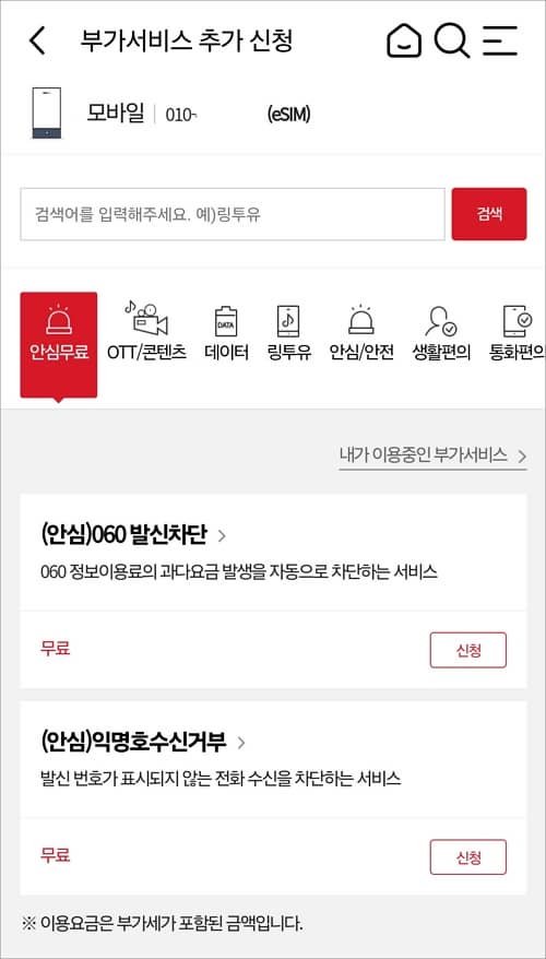 간략하게 살펴보면 일단 추가 가능한 서비스 종류가 상당히 많이 있습니다. 카테고리로 보자면 안심무료(발신차단/수신거부 등), OTT 및 콘텐츠(유튜브 프리미엄/티빙/디즈니 플러스/지니 등), 데이터, 링투유(컬러링/캐치콜 등), 안심 및 안전, 생활 편의, 통화 편의, 로밍, 무료 등이 있으며 각 서비스를 선택해 보시면 상세 내용을 확인해 볼 수 있습니다. 다양하게 제공되는 서비스인만큼 어떤 기능들이 있는지 한번 살펴보시고 추가 신청 또는 해지해 보시길 바랍니다.