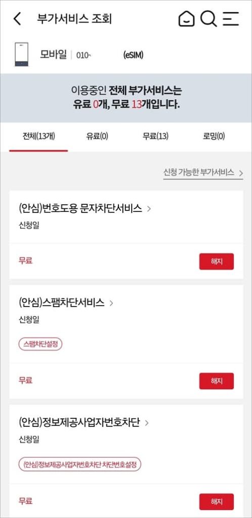 위에서도 잠깐 언급했듯이 필수 제공되는 부가서비스는 본인이 해지할 수 없습니다.