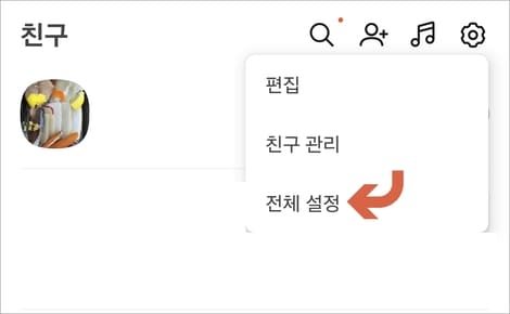 카톡 앱을 실행하고 우측 상단에 톱니바퀴 아이콘을 눌러 전체 설정에 들어갑니다.