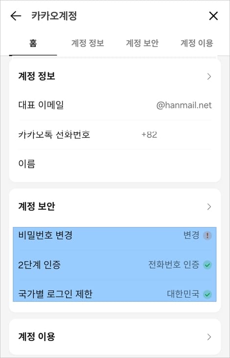 계정 보안 항목을 보시면 비밀번호 변경, 2단계 인증, 국가별 로그인 제한 설정을 해줄 수 있습니다.