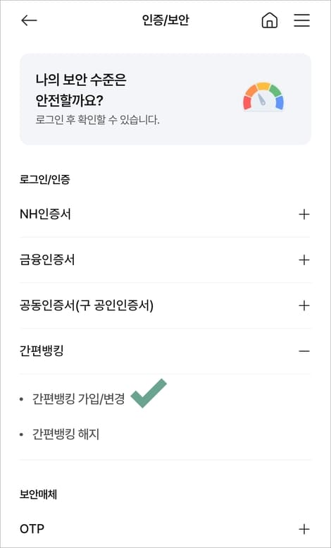 로그인/인증 항목에서 간편뱅킹을 눌러 가입/변경을 선택합니다.