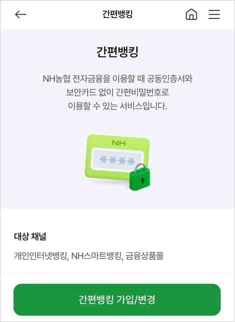 농협 간편뱅킹은 전자금융을 이용할 때 공동인증서와 보안카드 없이 간편 비밀번호로 이용할 수 있는 서비스입니다.