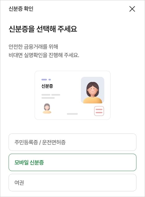 신분증 확인에서 주민등록증/운전면허증(실물 신분증 촬영), 모바일 신분증(행정안전부), 여권 중에 선택해서 비대면 실명확인을 진행합니다.