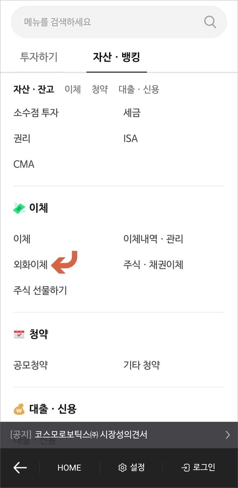 전체 메뉴 화면으로 이동하면 상단에 자산/뱅킹을 선택하고 이체 항목에서 외화이체에 들어갑니다.