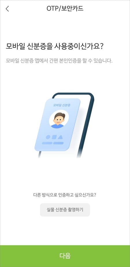 행정안전부의 모바일 신분증을 사용할 수 있다면 실물 신분증 대신 선택할 수 있습니다.