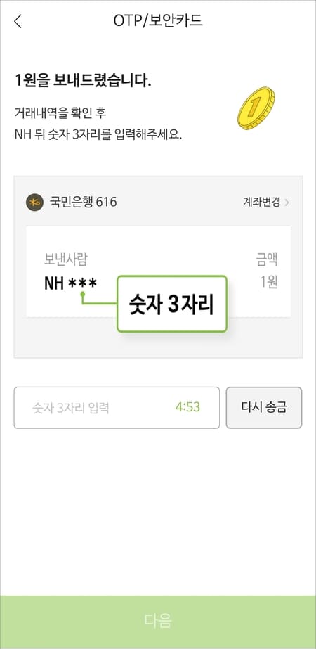 입력한 계좌번호로 1원이 입금되면 거래내역 조회해서 숫자 3자리를 확인하고 화면에 입력합니다.