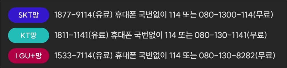 - SKT 망: 1번 가입 / 2번 서비스 문의(1번 요금 확인, 2번 요금제 문의, 3번 부가서비스, 4번 변경, 5번 정지 및 해지, 0번 상담사 연결) / 3번 선불 요금 충전 및 잔액 확인 / 4번 선불 서비스 / 5번 통화 품질 / 0번 상담사 연결