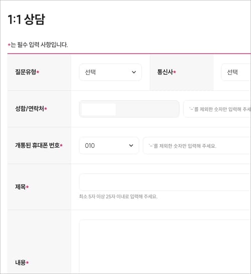 질문 유형, 통신사, 연락처, 휴대폰번호, 제목, 내용, 첨부파일 등을 입력하고 접수하시면 됩니다.